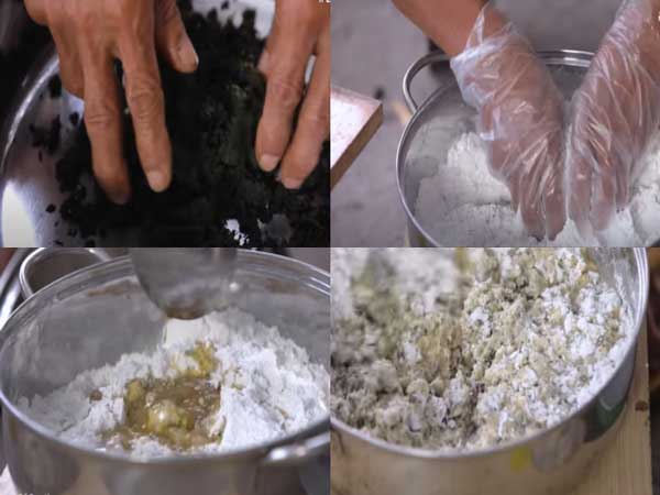 - Trộn bột: Trong một bát lớn, bạn cho bột nếp, lá gai đã giã nhuyễn, muối, và đường vào trộn đều. Sau đó, từ từ đổ nước cốt dừa vào hỗn hợp bột và dùng tay nhào cho đến khi bột mềm, mịn và không dính tay. Nếu bột quá khô, bạn có thể thêm một chút nước lọc.